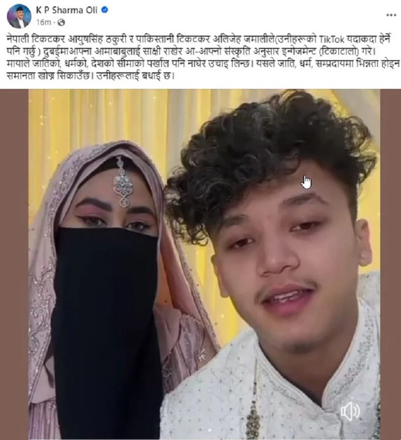 काठमाडौँ । नेकपा एमाले अध्यक्ष केपी ओलीले नेपाली नेपाली टिकटकर आयुषसिंह ठकुरी र पाकिस्तानी टिकटकर अलिजेहबीच भएको इन्गेजमेन्टको बधाई दिएका छन् । बिहिबार सामाजिक फेसबुकमार्फत बधाई दिँदै उनले ठकुरी र अलिजेह जमालीको टिकटक आफूले पनि हेर्ने बताएका छन् । ओलीले मायाले जातिको, धर्मको, देशको सीमाको पर्खाल पनि नाघेर उचाई लिने बताएका छन् ।