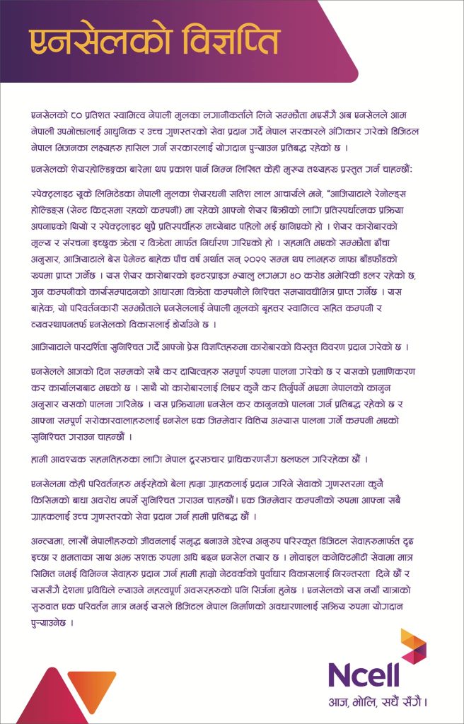 जुन कम्पनीको कार्यसम्पादनको आधारमा विक्रेता कम्पनीले निश्चित समयावधीभित्र प्राप्त गर्नेछ । यस बाहेक, यो परिवर्तनकारी सम्झौताले एनसेललाई नेपाली मूलको बृहतर स्वामित्व सहित कम्पनी र व्यवस्थापनतर्फ एनसेलको विकासलाई डोर्याउने एनसेलको भनाई छ ।