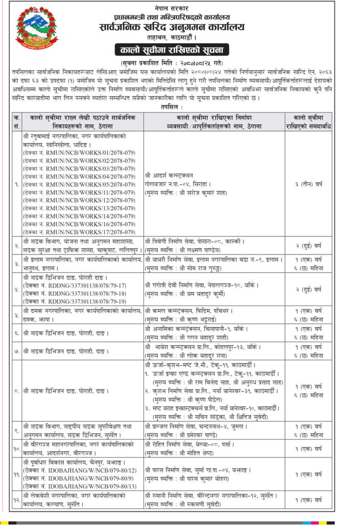 प्रधानमन्त्री तथा मन्त्रिपरिषद् कार्यालय अन्तर्गतको सार्वजनिक खरिद अनुगमन कार्यालयले विभिन्न सार्वजनिक निकायहरुले लेखी पठाएको आधारमा १२ कम्पनीहरुलाई कालो सूचीमा राखेको हो ।