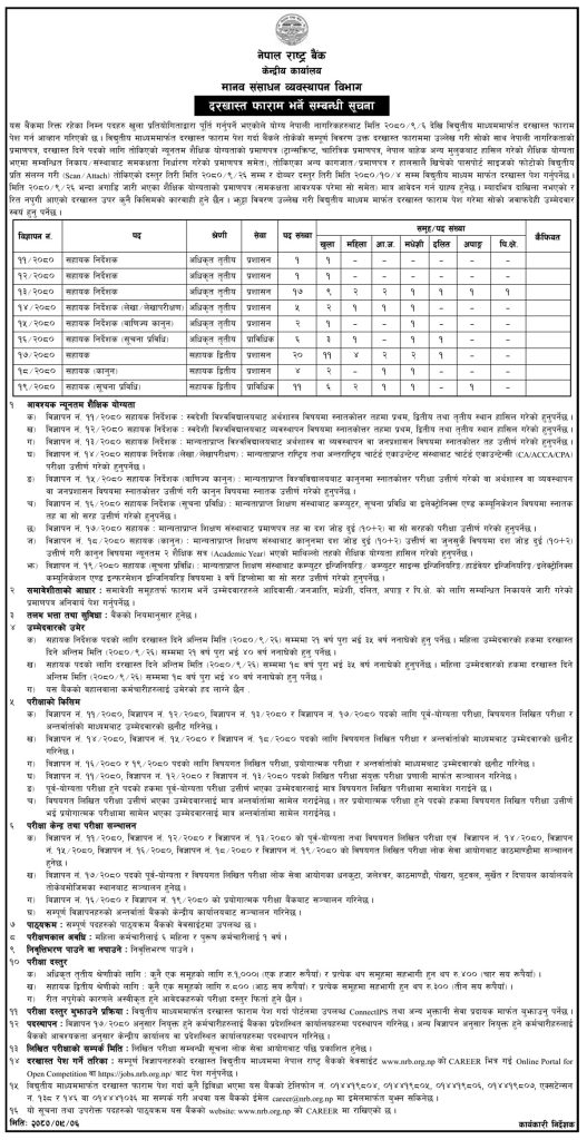 राष्ट्र बैंकले अधिकृत तृतीय श्रेणीमा प्रशासन तथा प्राविधिक सेवाअन्तर्गत सहायक निर्देशक र सहायक द्वितीय श्रेणीमा कर्मचारीहरु माग गरेको हो। सबै पदमा गरी राष्ट्र बैंकले ६७ जना कर्मचारी माग गरेको छ।