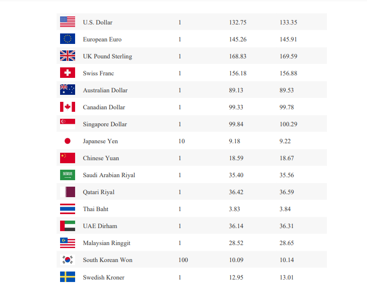 राष्ट्र बैंकले सार्वजनिक गरेको मुल्य अनुसार अमेरिकी डलर खरिददर १३२ रुपैयाँ ७५ पैसा र बिक्री दर १३३ रुपैयाँ ३५ पैसा तोकेको छ भने युरो एकको खरिददर १४५ रुपैयाँ २६ पैसा र बिक्री दर १४५ रुपैयाँ ५१ पैसा तोकिएको छ।
