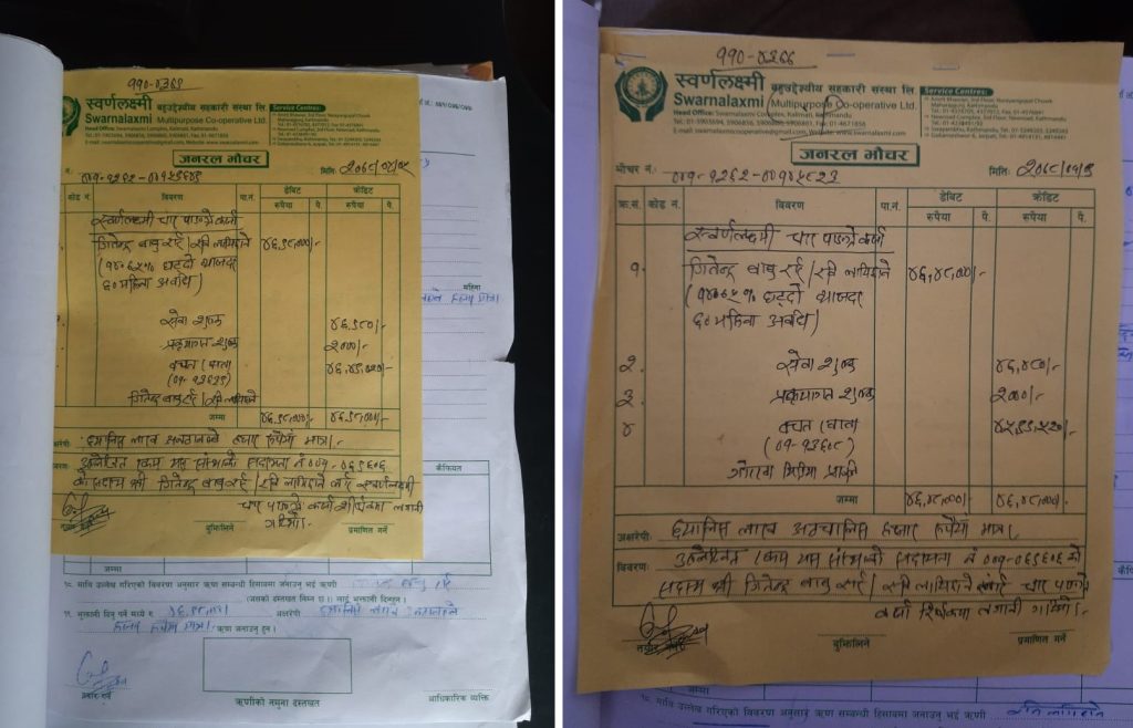 यो ऋण उनीहरूले ‘स्वर्णलक्ष्मी चार पांग्रे कर्जा’ शीर्षकमा लिएको दाबी गरिएको छ। भौचरमा गोर्खा मिडिया प्रालिलाई उक्त रकम दिइएको दाबी गरिएको छ।