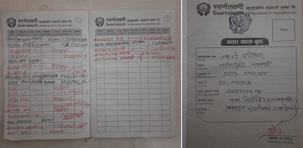 यो सहकारी २०५६ सालमा स्थापना भएको हो। लक्ष्मीले सहकारीमा २०६५ सालदेखि बचत गर्न थालेकी थिइन्। २०७८ सालमा नयाँ पासबुक लिएयता बचत गरेको रकम लाखौं देखिन्छ।