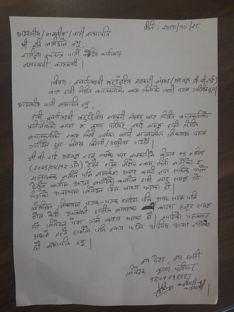 बचत रकम फिर्ता नपाएर हायलकायल भएका कृष्ण गत माघ २८ गते फेरि राष्ट्रिय स्वतन्त्र पार्टीको कार्यालयमा पुगे। सभापति लामिछानेलाई सम्बोधन गरेर चिठी लेखेर छोडेका छन्।